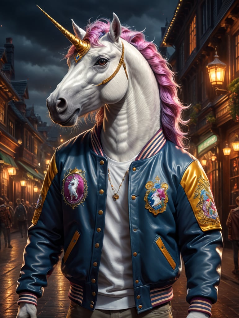 Premium Free ai Images funny unicorn character in varsity jacket Very well made.