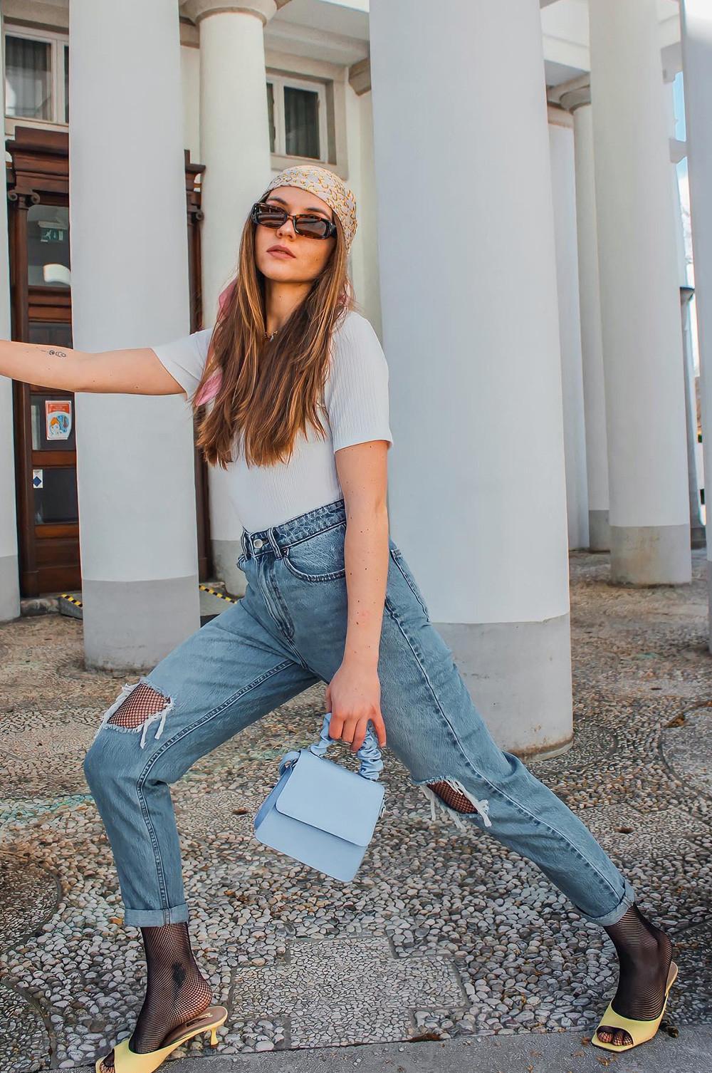 Outfit Jeans strappati e calze a rete colorate Lo stile di Artemide Very well made.